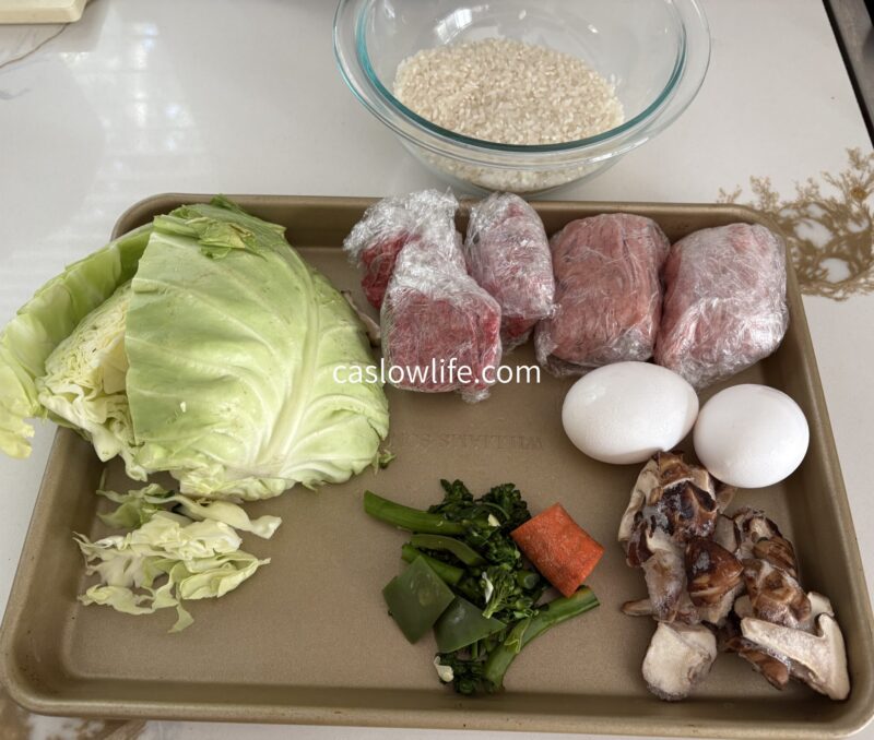 - 淡色野菜(キャベツ, きのこ類など)・・・420g(今回はマッシュルーム50g+キャベツ370g)