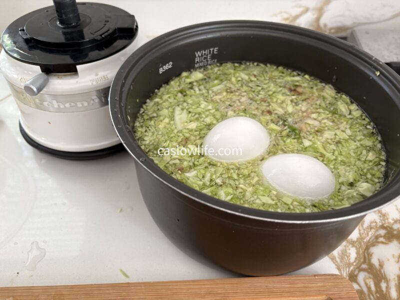 - 炊飯器の中に、卵以外の材料(米、野菜、肉)を入れ、水を加えます。